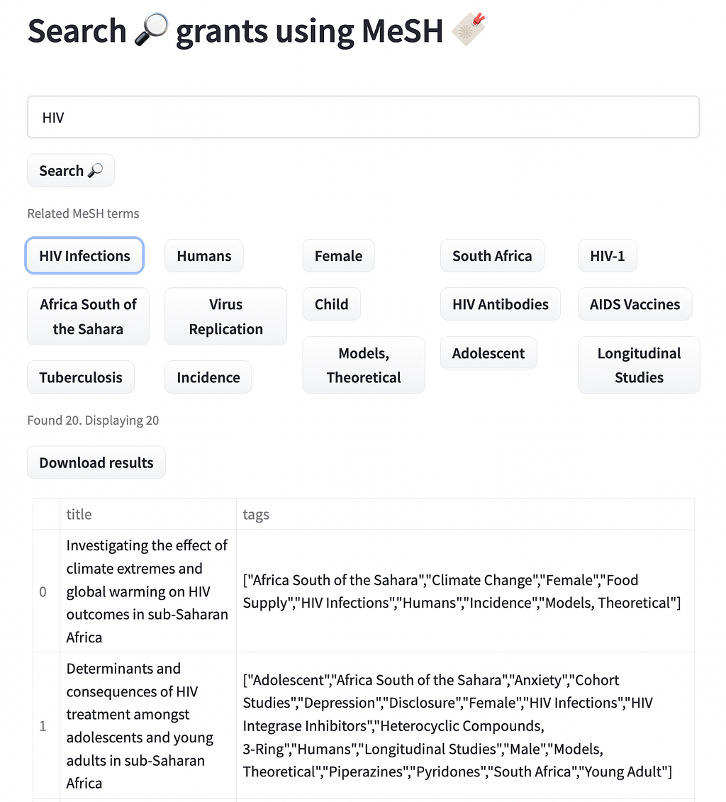 We created a demo of how those tags can be used to search Wellcome grants. The data is based on the openly available data through 360giving. You can access the demo here https://huggingface.co/spaces/mantisnlp/SearchMesh
