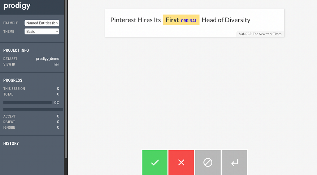 Other than the fact that active learning is not a silver bullet, another reason it might not be so prevalent in practice is that few annotation tools support it out of the box. Prodigy, which is made by the same people behind SpaCy (a very popular open source NLP library) comes with active learning baked in. Prodigy has gone a step further and implemented a binary active learning annotation scheme which makes data annotation even more efficient. How does binary annotation differ from standard active learning? Let’s see a Named Entity Recognition example from the demo page.