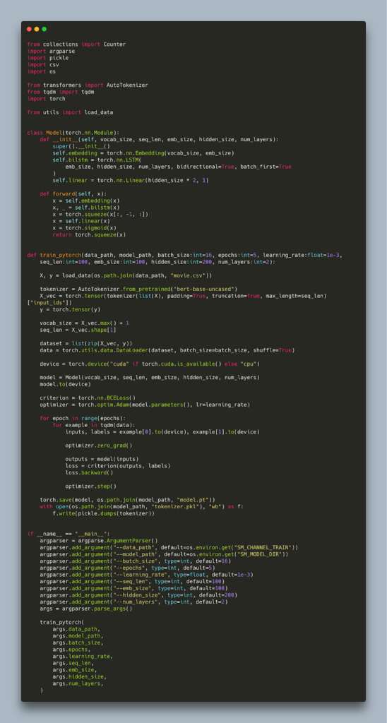 This is excellent for quick prototyping but in practice our code lives in separate modules to reduce duplication, and often requires additional libraries. Case in point: all our training scripts from the previous post were sharing the same load_data function and our PyTorch script had to implement its own tokenizer in the absence of additional libraries.