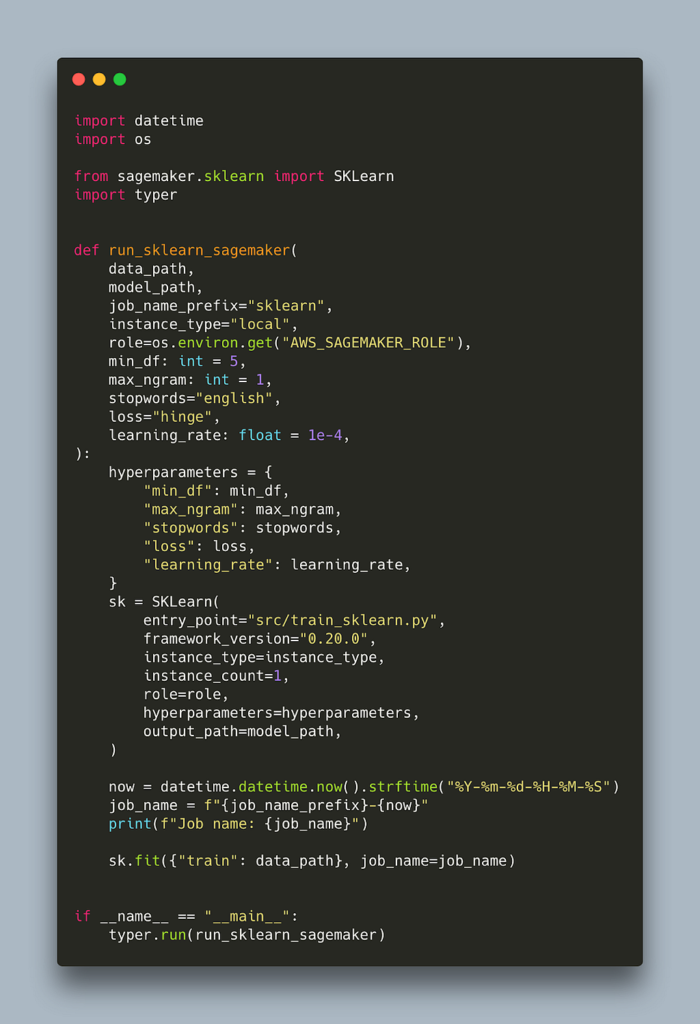Our training script defined in the entry_point is copied inside the container. Note that our training script only uses the standard library and scikit-learn. If it was using a library not present in the container, SageMaker would throw an error. This is why we opted for argparse instead of typer for passing command line arguments to that script. We can define additional dependencies that will be installed in the container but let’s leave that for the next blog.