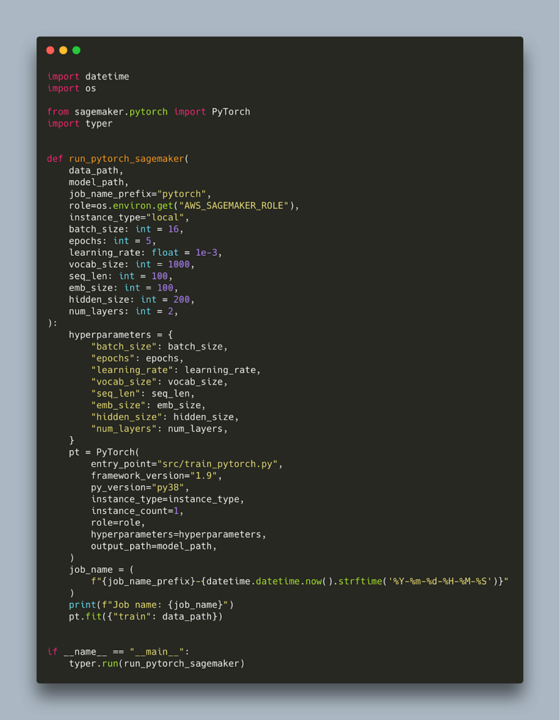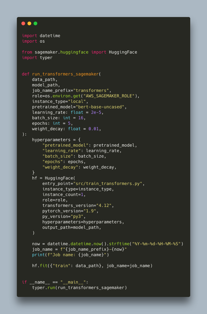 The main library we need is sagemaker (which can be installed from pip as usual) but I am also going to be using typer for adding command line tool (CLI) functionality to my scripts. Other than those I will only use tqdm for adding progress bars, black for formatting and pytest for tests. All this is on top of the framework you want to experiment with, which in my case also includes pytorch, transformers, and sklearn.