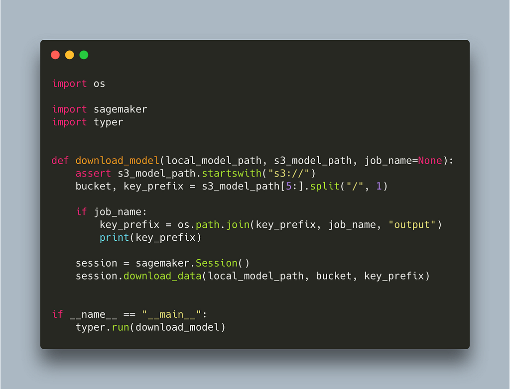 Note that we introduce an optional parameter job_name. This is because SageMaker does not only save the model in the model_path but also some other information like logs. If we simply want to download the model, this is stored inside job_name/output which is one of the reasons we want to have control of the job name instead of having it auto generated.