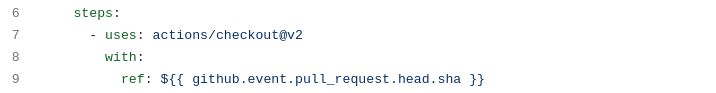 Next we checkout the GitHub repo onto our instance using one of GitHub’s inbuilt actions: checkout. We also specify that we want to checkout the HEAD commit of the pull request from where the job was launched (we assume here it is launched from a PR).