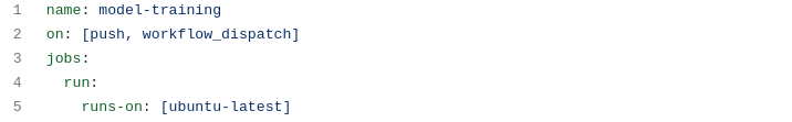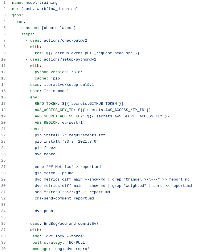 Iterative.ai, the people behind DVC and CML, provide a number of examples of GitHub workflow yamls in the CML GitHub repo. We just need to add two additional stages to one of the default workflows to get our pipeline running like we want it.
