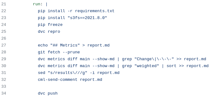 We also format the dvc metrics by both adding the — show-md flag to format the tables in markdown, and we grep out the parts of the report that we are interested in (line 26 is just the titles, line 27 is just the weighted metrics, line 28 removes the path from filenames).