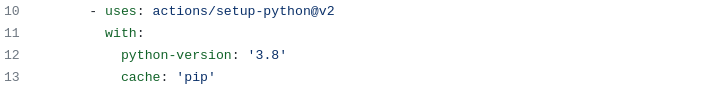 Next we set up Python, again using another inbuilt GitHub action. Here we specify the version we’re interested in. This should match our local development environments. Note that we can also tell GitHub to cache our pip dependencies here. This will save us a bit of time next time we run this action, as it will not need to download the packages from the internet — instead it will get them from a local cache.