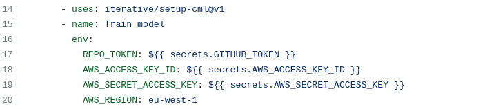 The next step is a big one. We use iterative’s setup-cml action to set up CML so that we can pull and push objects from the remote DVC storage. We also need to pass some credentials to the action. These must be set in the github GUI or using the gh command line tool. We need to pass credentials to an AWS account to grant CML access to the S3 bucket remote storage used by DVC.