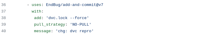 The final step is to add the dvc.lock file to git and commit it using a third party action. Note that we set the pull_strategy to NO-PULL this prevents issues if the instance tries to pull the latest changes before committing the changes it has made.